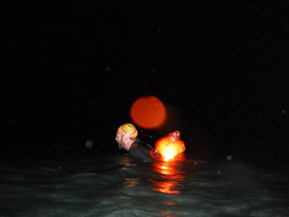 Halloween. I had just finished 3 weeks of solid work. I had just had a hectic day. I drove through rush-hour traffic down the M5 to Goodrington Beach, Paignton to meet up with the other Happy Wild Swimming group for a Halloween night swim. I was late. I hadn’t even had time to get a costume. I got out of the car and straight into my wetsuit, barely able to talk with leftover stress from the day and drive, following the fancy-dressed group down the beach.
